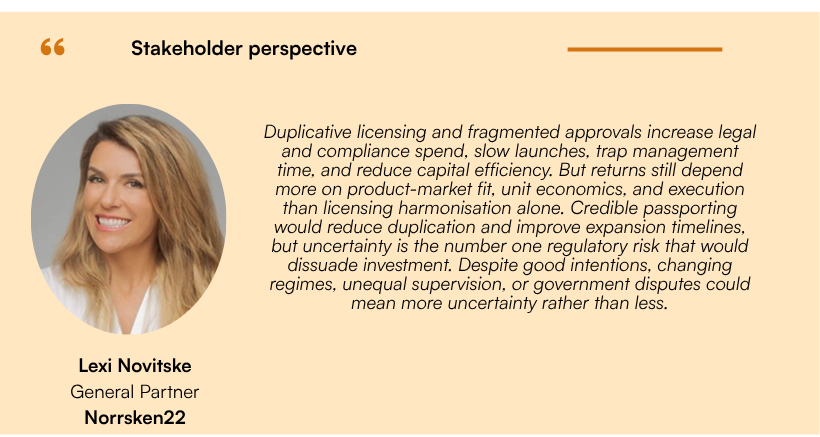 As Lexi Novitske, partner at Norrsken22, noted in response to the CBN report, the practical implementation of new regulatory frameworks will matter as much as the concept of passporting itself