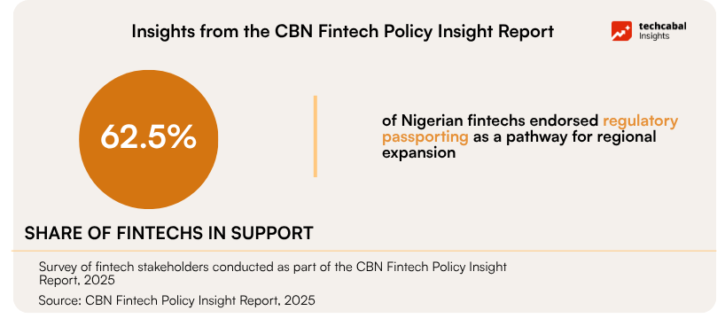 According to the CBN survey, 62.5% of fintech stakeholders already operate in or plan to expand into other African markets, and the same share supports the development of a regulatory passporting framework.